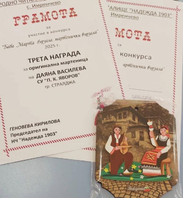 Теодора Маринова и Гъокчен Андреева от 6️⃣а клас бяха наградени с 📜грамоти и предметни награди в категория-🖼рисунка от конкурса: „Будителите на Ямбол” с подтема „Участието на ямболци в Съединението и Сръбско-българската война”, обявен от Регионалния исторически музей.