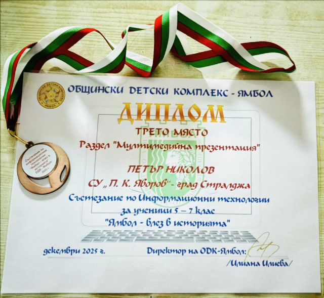 С радост споделяме, че Петър Николов oт 6 Б клас, ученик в СУ „П. К. Яворов“ – гр. Стралджа спечели 🥉 Трето място в раздел С радост споделяме, че Петър Николов oт 6 Б клас, ученик в СУ „П. К. Яворов“ – гр. Стралджа спечели 🥉 Трето място в раздел „Мултимедийна презентация“ на Състезанието по информационни технологии за ученици от 5.–7. клас „Ямбол – влез в историята“, организирано от Общински детски комплекс – Ямбол.